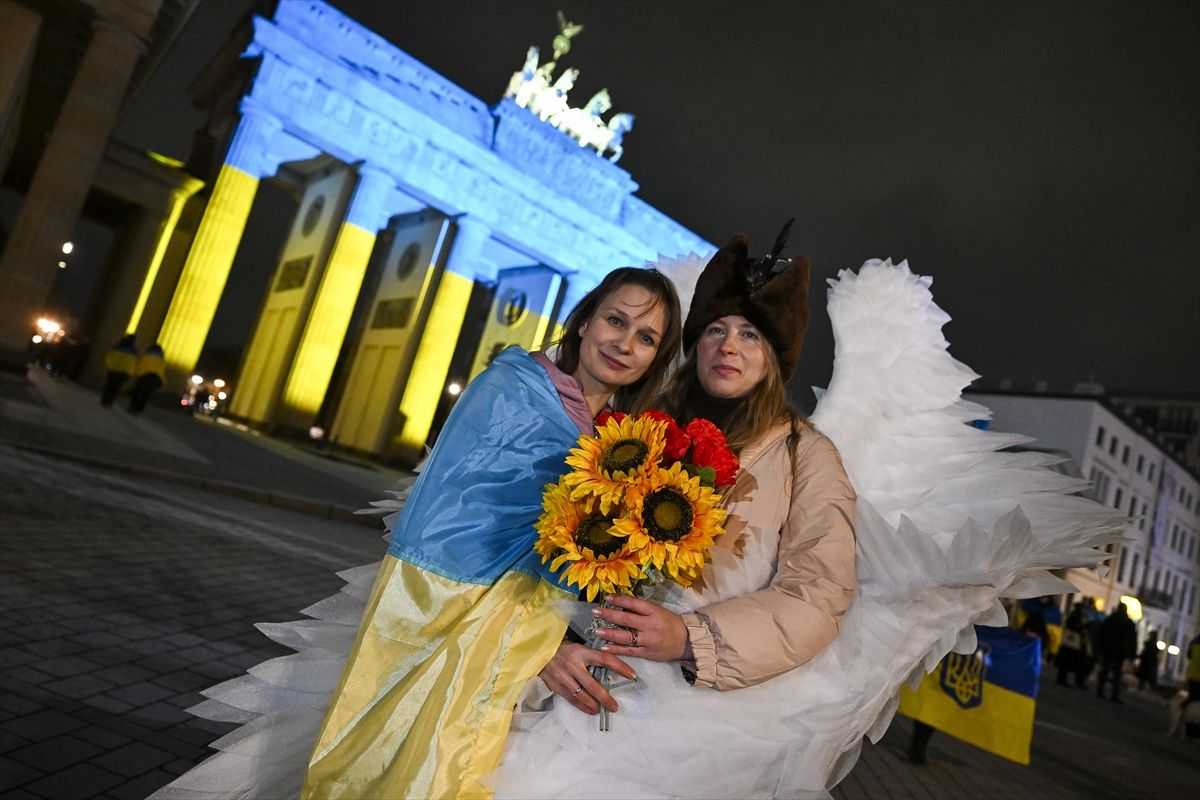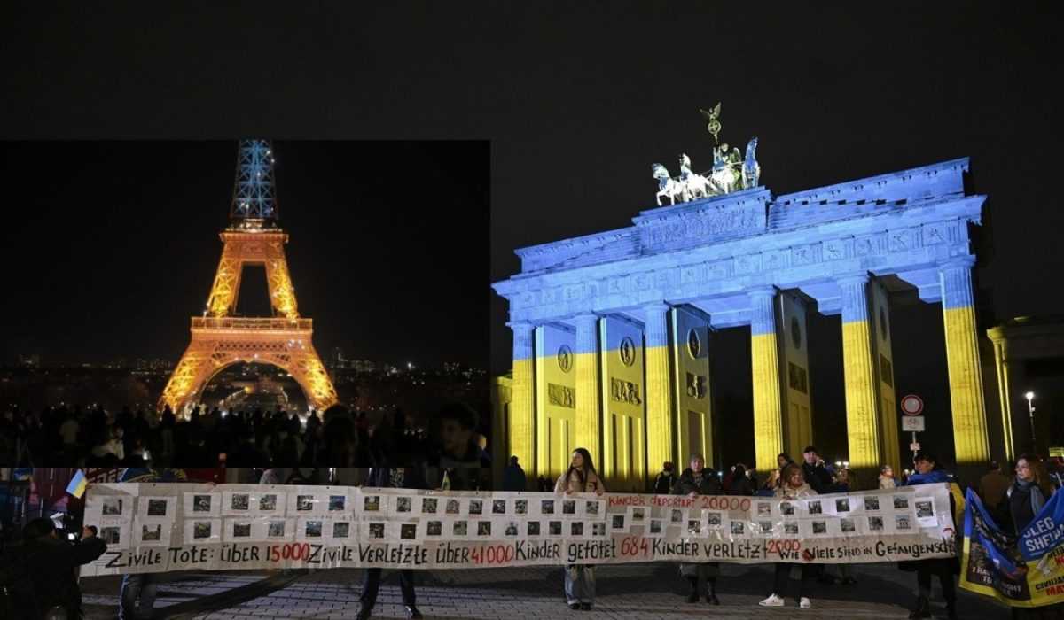 Brandenburška vrata i Eiffelov toranj, simboli Berlina i Pariza, bili su osvijetljeni bojama ukrajinske zastave. Nosile su se ukrajinske zastave i skandirali slogane podrška Ukrajini.