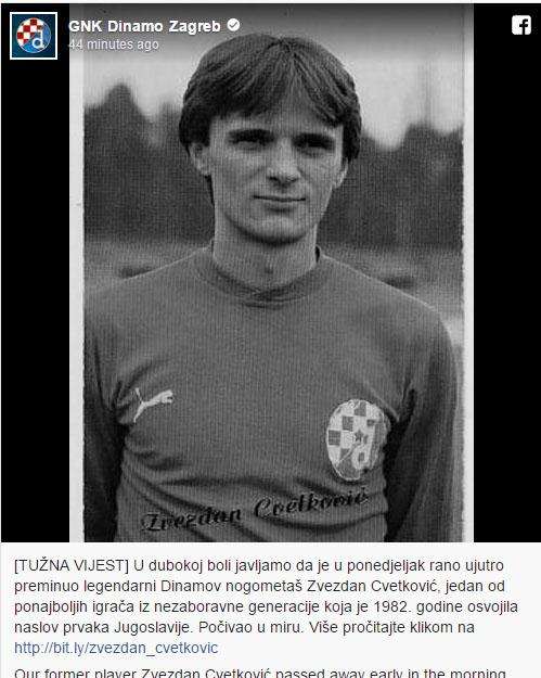 Bivši nogometaš Dinama Zvezdan Cvetković bio je pripadnik slavne generacije koja je 1982. osvojila prvenstvo bivše Jugoslavije, a radio je i kao sportski direktor Dinama.