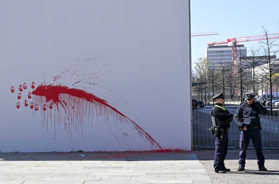 Video koji je objavila grupa “Mirno protiv genocida” prikazuje tragove crvene boje i otiske ruku na zidu ureda kancelara.