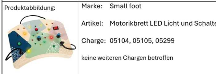 Razlog opoziva su sitni dijelovi koji se mogu odvojiti i progutati. Riječ je o motoričkoj ploči s LED svjetlom i prekidačem. Postoji opasnost da se mali dijelovi odvoje od proizvoda.