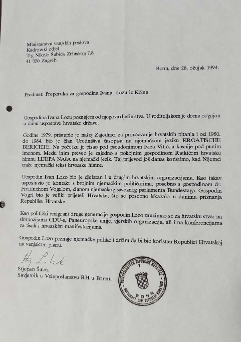 Šulek je svjedok vremena i događaja. Bio je u delegaciji koju sam ja sastavio i u travnju 1982. i predvodio na sastanku sa dr. Vogelom. Također je bio i član delegacije hrvatskih emigranata 1991. na sastanku sa ministrom Hans-Dietrich Genscherom u njegovom kabinetu. Ovdje, zbog povijesne istine nadopunjujem Šulekov prikaz. Naime, nisam ja uspostavio vezu sa dr. Vogelom i političkim Bonnom, već sam tu vezu 1982. samo preuzeo od hrvatskog političkog emigranta dr.rer.pol., dipl.ing. Drage Matkovića te zahvalom dr. Vogela godinama znatno proširio.