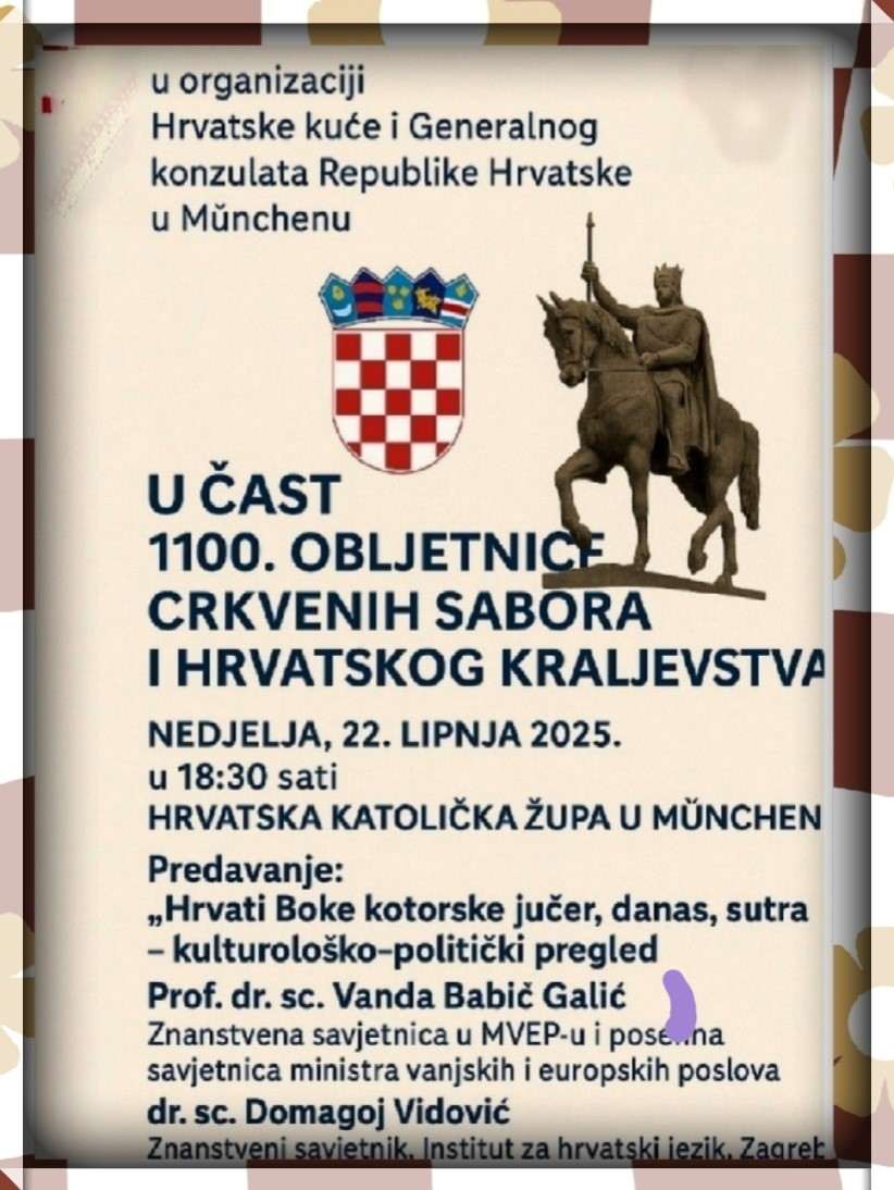 U povodu obilježavanja 1100. obljetnice Crkvenih sabora i Hrvatskog kraljevstva, u prostorijama Hrvatske katoličke župe u Münchenu održat će se tematsko predavanje pod naslovom “Hrvati Boke Kotorske – jučer, danas, sutra”.